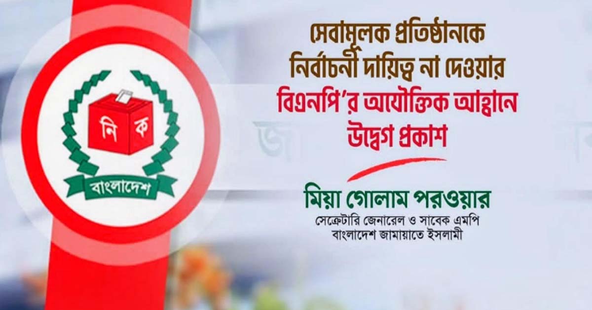 ইসলামি ব্যাংক, সহ বিভিন্ন সেবামূলক প্রতিষ্ঠানকে নির্বাচনী দায়িত্ব না দেওয়ার বিএনপি’র অযৌক্তিক আহ্বানে উদ্বেগ প্রকাশ করেছে বাংলাদেশ জামাত ইসলামের কেন্দ্রীয় সেক্রেটারি জেনারেল অধ্যাপক মিয়া গোলাম পরওয়ার।