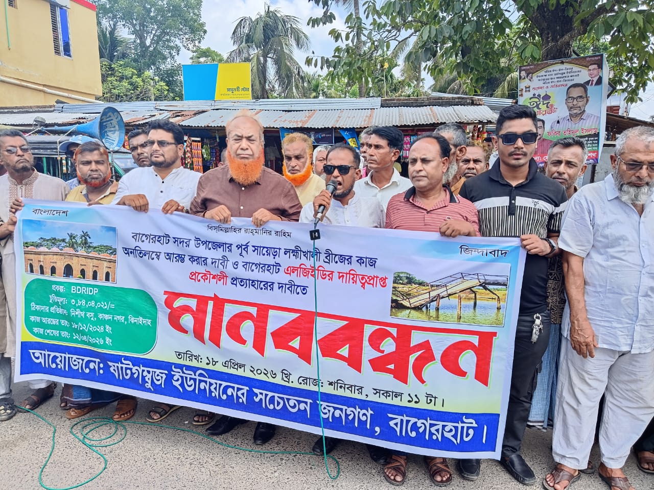 বাগেরহাটে লক্ষ্মীখালী খালের উপর ব্রিজ নির্মাণ ও নির্বাহী প্রকৌশলী প্রত্যাহারের দাবীতে মানববন্ধন