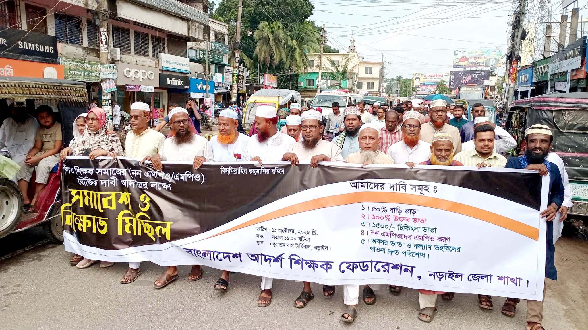 শিক্ষকদের ৫০% বাড়ি ভাড়া, ১০০% উৎসব ভাতা সহ পাঁচ দফা দাবিতে নড়াইলে আদর্শ শিক্ষক ফেডারেশনের উদ্যোগে বিক্ষোভ মিছিল ও সমাবেশ অনুষ্ঠিত হয়েছে। শনিবার বেলা ১১টায় নড়াইল শহরের পুরাতন বাস টার্মিনাল এলাকা থেকে একটি বিক্ষোভ মিছিল বের হয়। মিছিলটি শহরের বিভিন্ন সড়ক প্রদক্ষিণ শেষে নড়াইল প্রেসক্লাবের সামনে গিয়ে শেষ হয়।