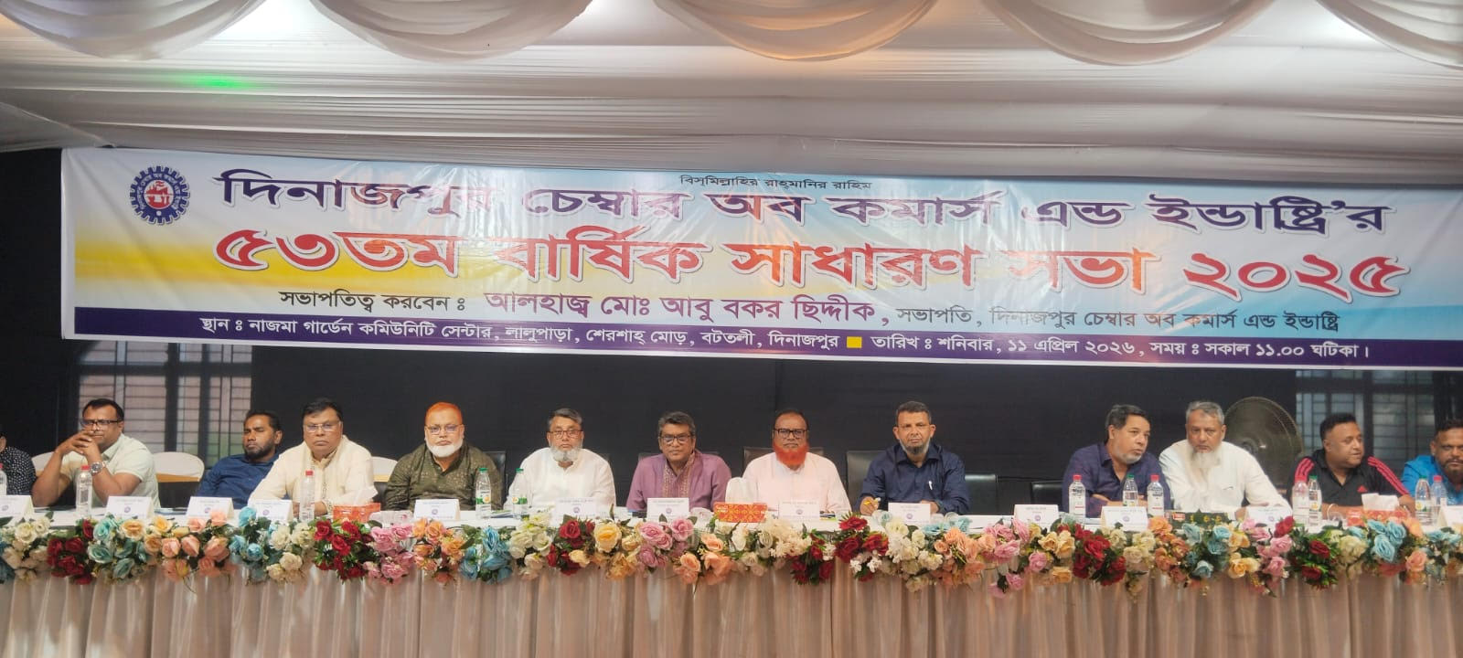 দিনাজপুর চেম্বার অব কমার্স অ্যান্ড ইন্ডাস্ট্রির ৫৩তম বার্ষিক সাধারণ সভা অনুষ্ঠিত হয়েছে। শনিবার (১১ এপ্রিল ২০২৬) সকাল সাড়ে ১১টায় শহরের নাজমা গার্ডেন কমিউনিটি সেন্টারে সাধারণ