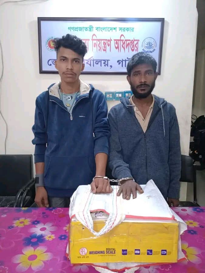 গাইবান্ধার সুন্দরগঞ্জ উপজেলায় অভিযান চালিয়ে ৩ কেজি গাঁজাসহ দুই মাদক কারবারিকে গ্রেফতার করেছে মাদকদ্রব্য নিয়ন্ত্রণ অধিদপ্তর। সোমবার (৬ এপ্রিল ২০২৬) রাত সাড়ে ১০টার দিকে উপজেলার
