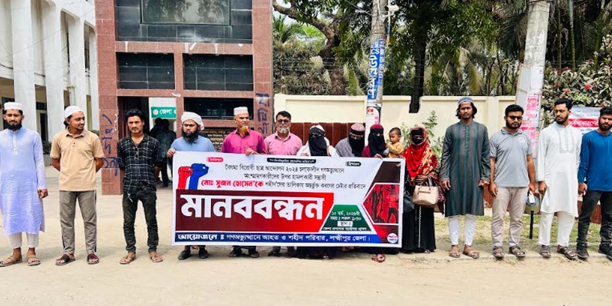 লক্ষ্মীপুরে জুলাই গণঅভ্যুত্থানে শিক্ষার্থীদের ওপর হামলার অভিযোগে নিহত সুজনকে শহীদের তালিকায় অন্তর্ভুক্ত করার চেষ্টার প্রতিবাদে মানববন্ধন করেছেন শহীদ পরিবারের সদস্য ও আহত যোদ্ধারা। মঙ্গলবার (১০